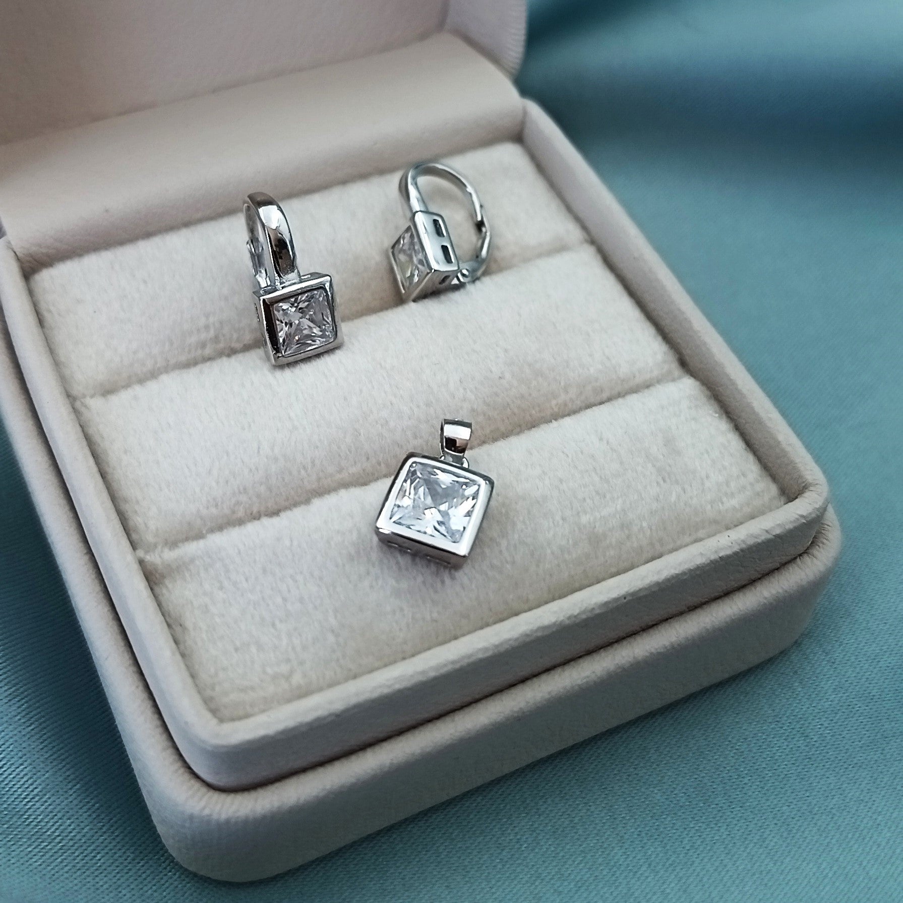 Aretes y dije de plata 925 con baño de oro blanco( no incluye cadena). Un clásico elegante y muy versátil en joyería.
