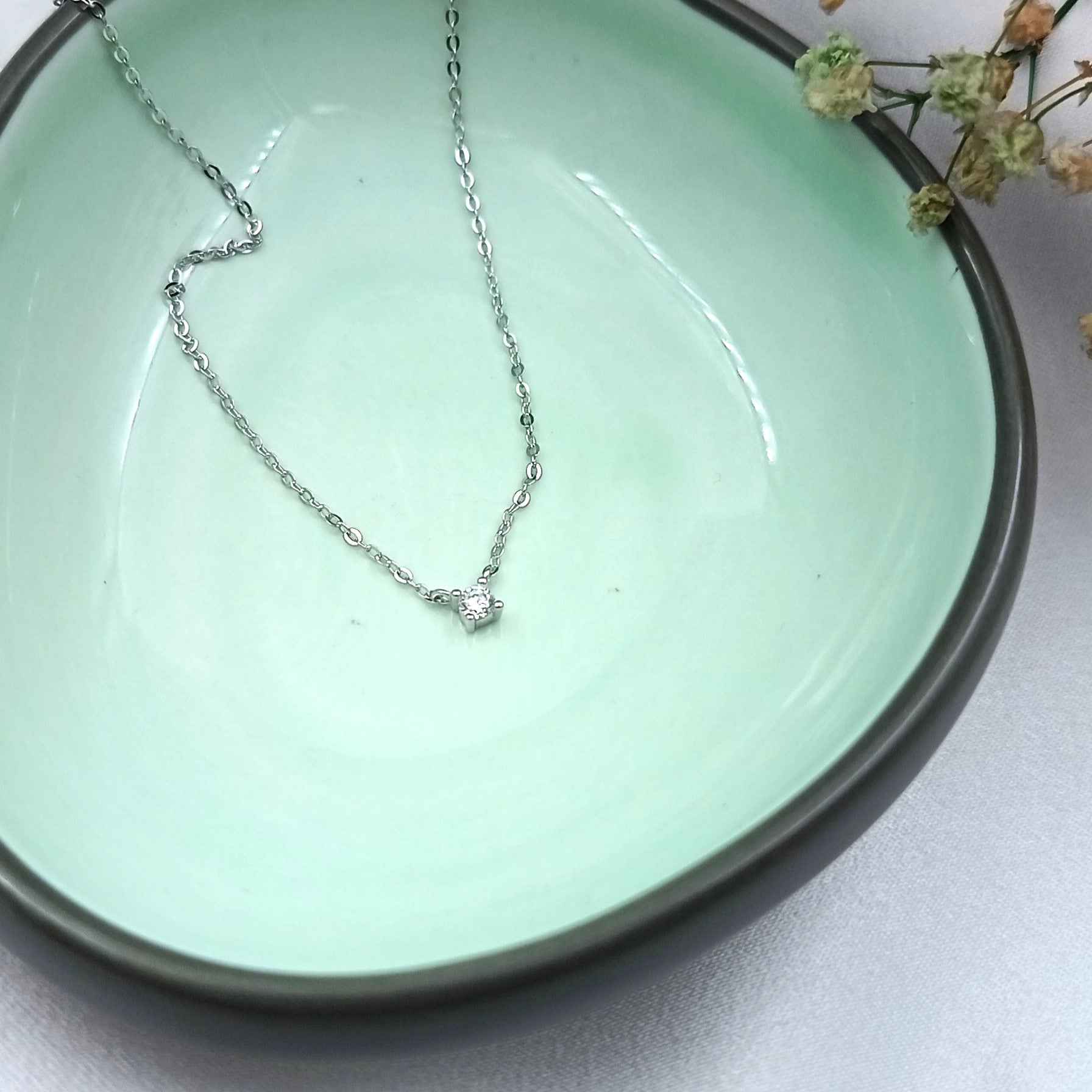 Collar de plata 925, con baño de oro blanco. Punto de Luz , simboliza luz interior, pureza y amir sincero, la verdadera elegancia está en lo sencillo.