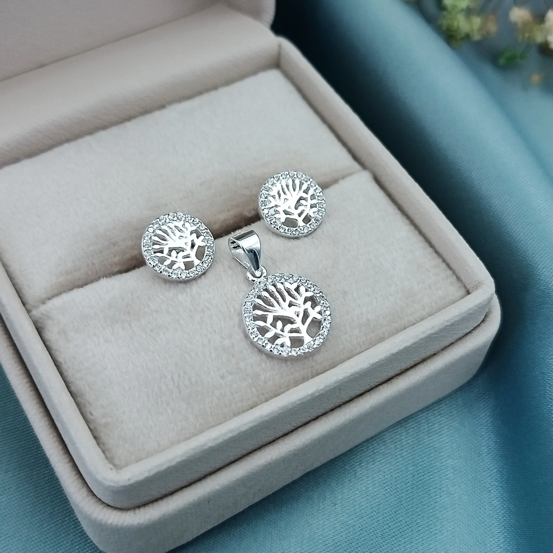 Conjunto de aretes y dije , plata 925. Motivo Árbol de la Vida, su significado general está relacionado con la conexión, sabiduría, y energía vital.