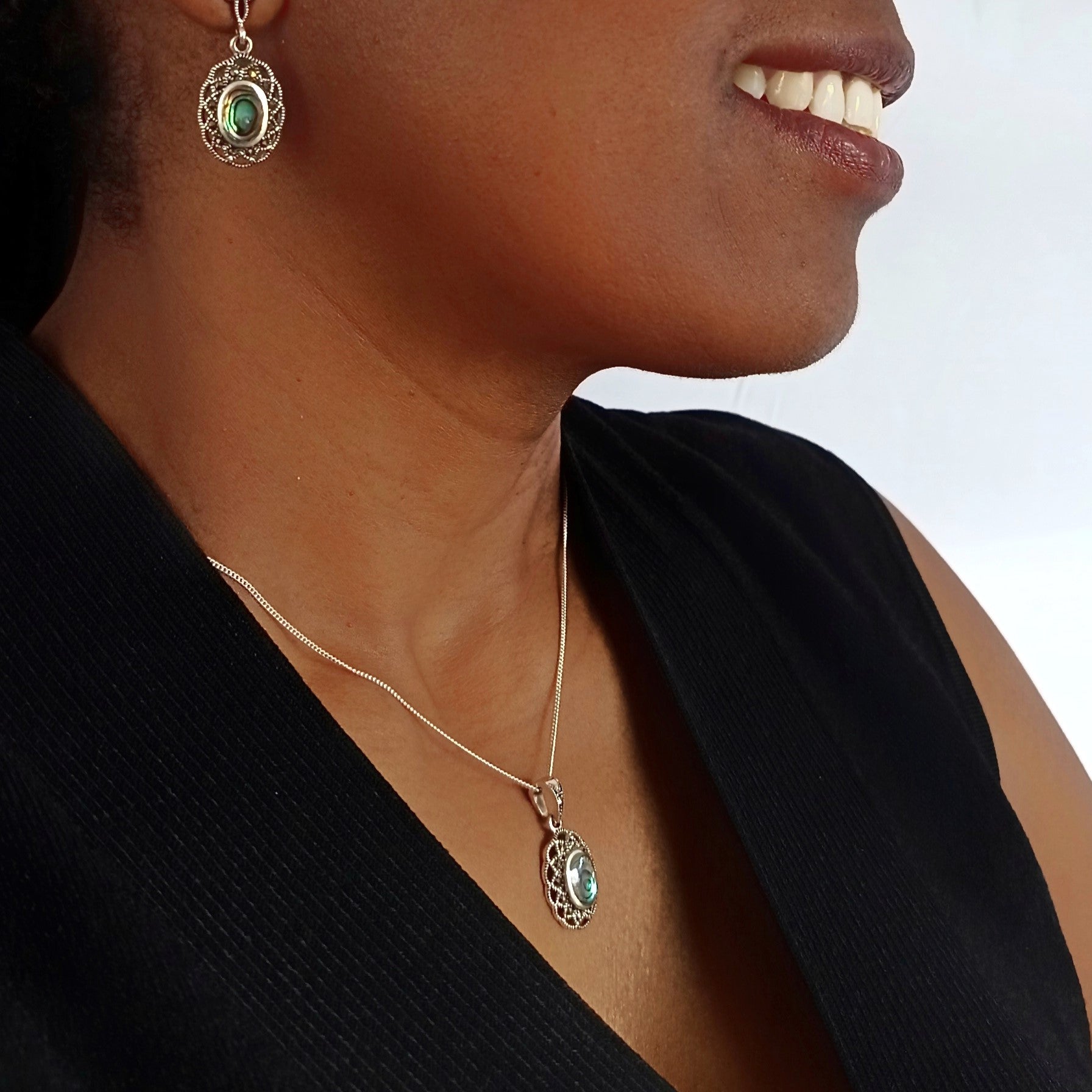 Conjunto de aretes y dije plata 925 con marquesitas y nácar. Simboliza paz, luz y belleza interior.